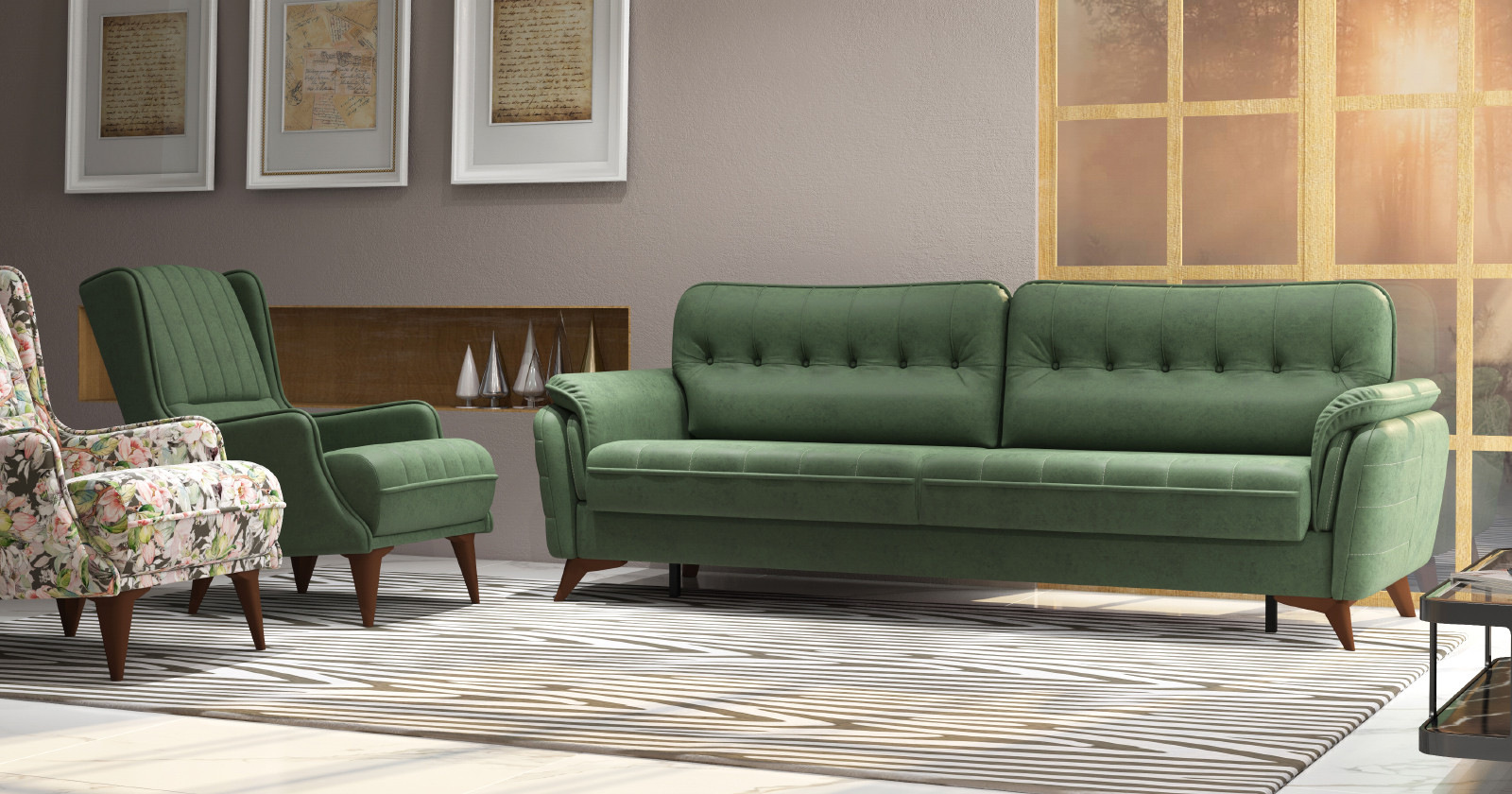 • Декоративные канты на подушках дивана, подлокотниках и сиденье. Стежка на передней части сиденья и внешней части подлокотника. Защипы на верхней части подушки. Втяжки с пуговицами на приспинных подушках.